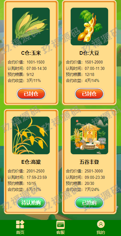 合约价值:100~500RMB,开仓时间:9:00–9:30,预约消耗粮票3/4个,合约收益1天5%