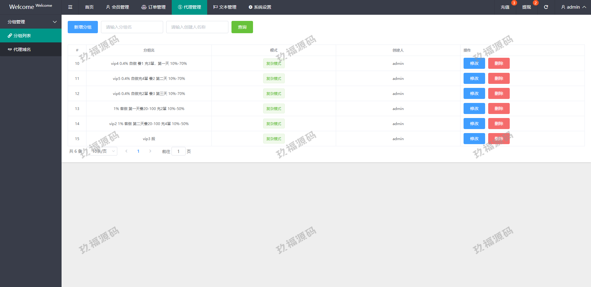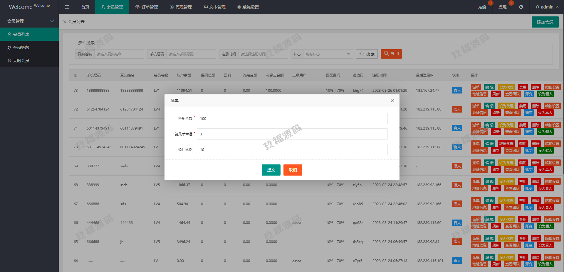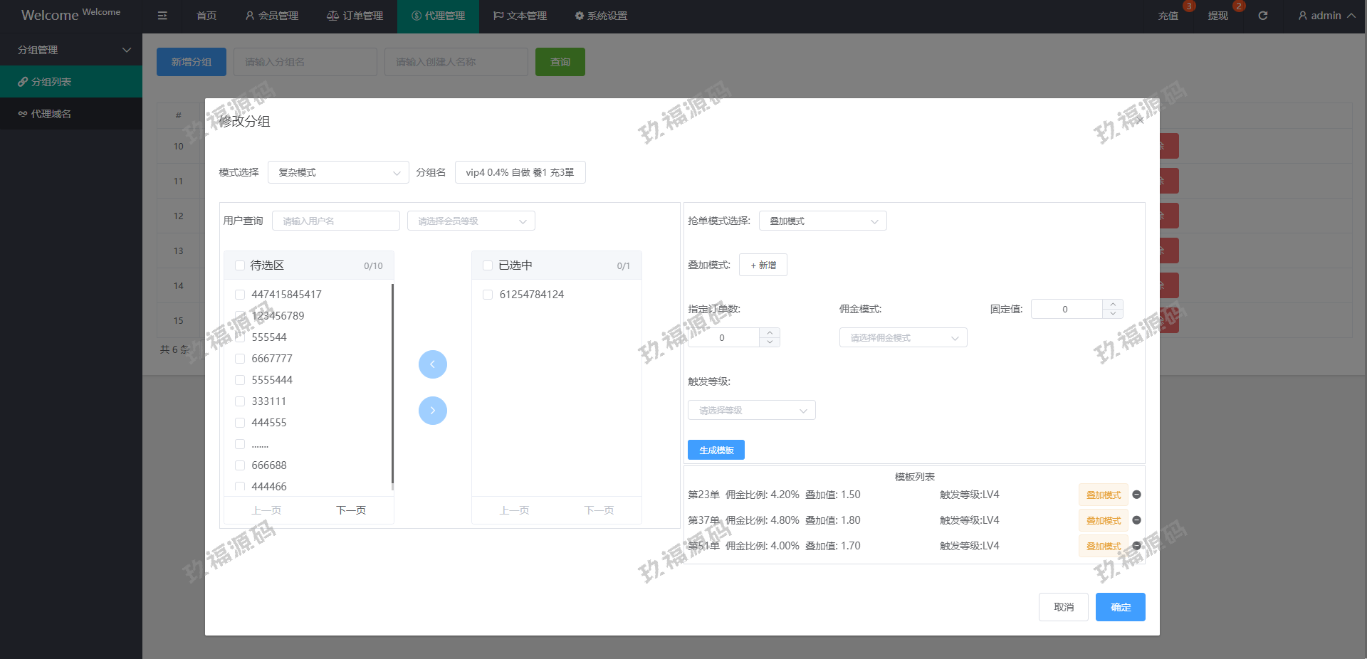 系统支持派单、分组、余额宝、代理后台等功能
