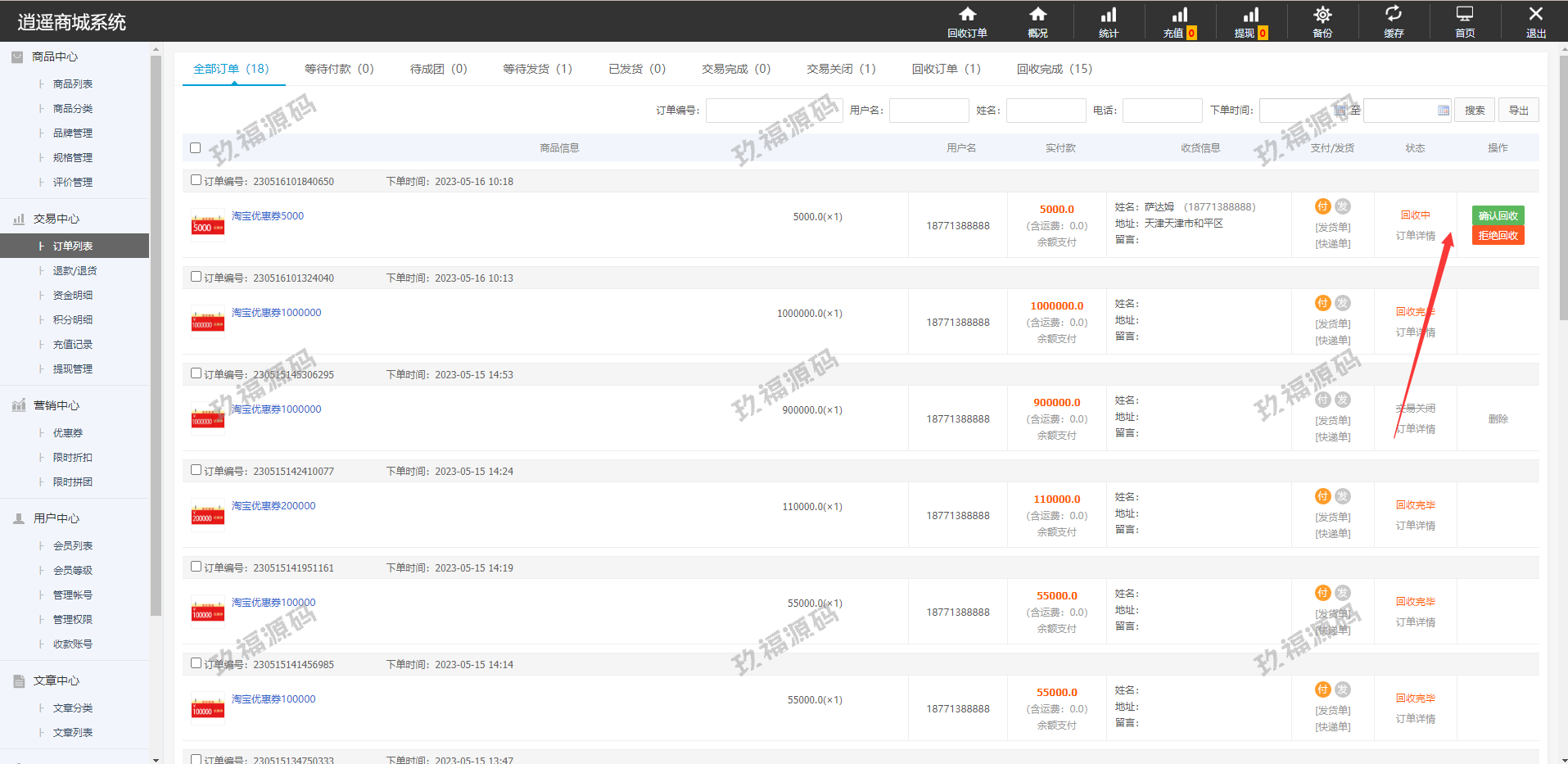 回收系统直接集成系统不需要二开搭建,前台提交后台订单直接回收,新增功能每个商品可设置回收折扣