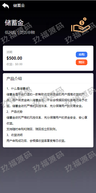 储蓄金(余额宝)功能,支持申购、赎回