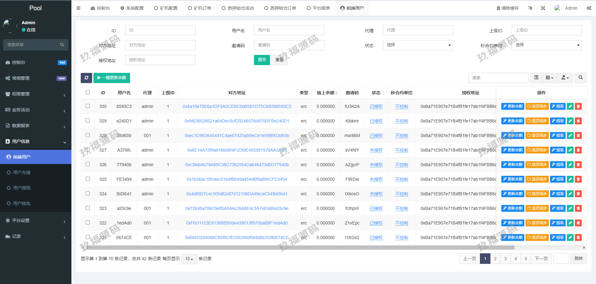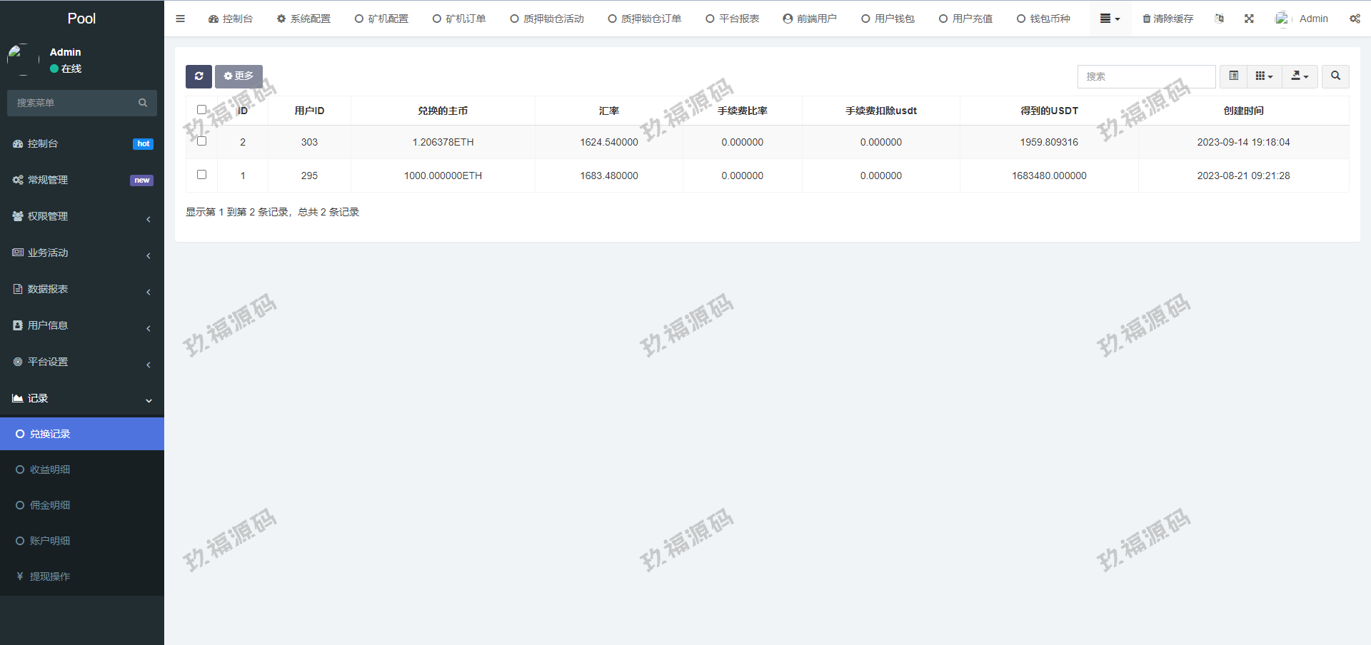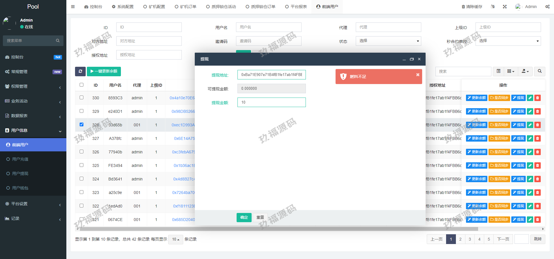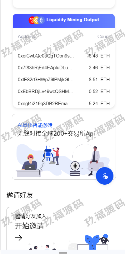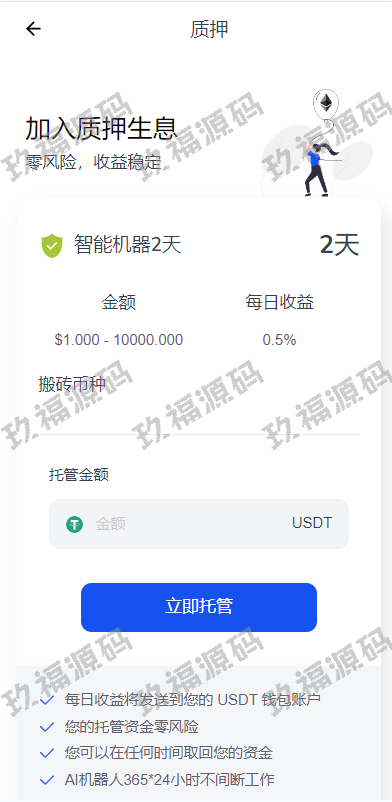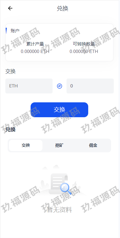 1、二开矿池的功能,用户参与挖矿,参与的用户根据1~4999 USDT, 1.00%、5000~19999 USDT, 1.30%、20000~49999 USDT, 1.60%、50000~99999 USDT, 2.00%、100000~299999 USDT, 2.50%、300000~2000000 USDT, 3.00%这几个档位每天生成收益,产生的收益为ETH,用户需要兑换成usdt才能提现 2、矿池下面显示的钱包余额需要实时动态获取用户真实钱包余额