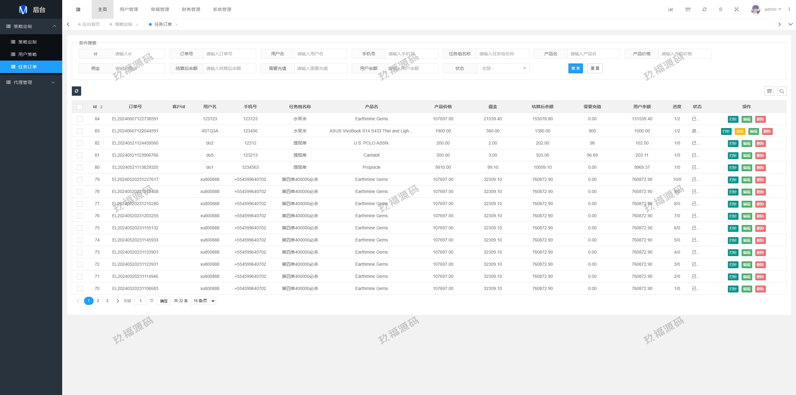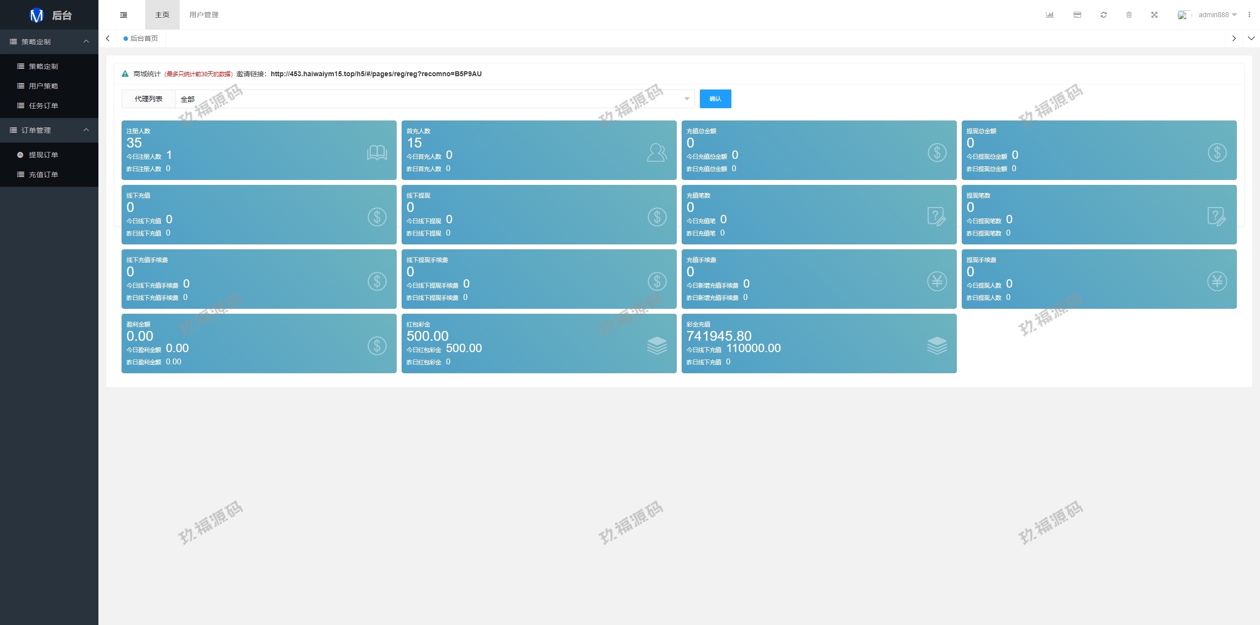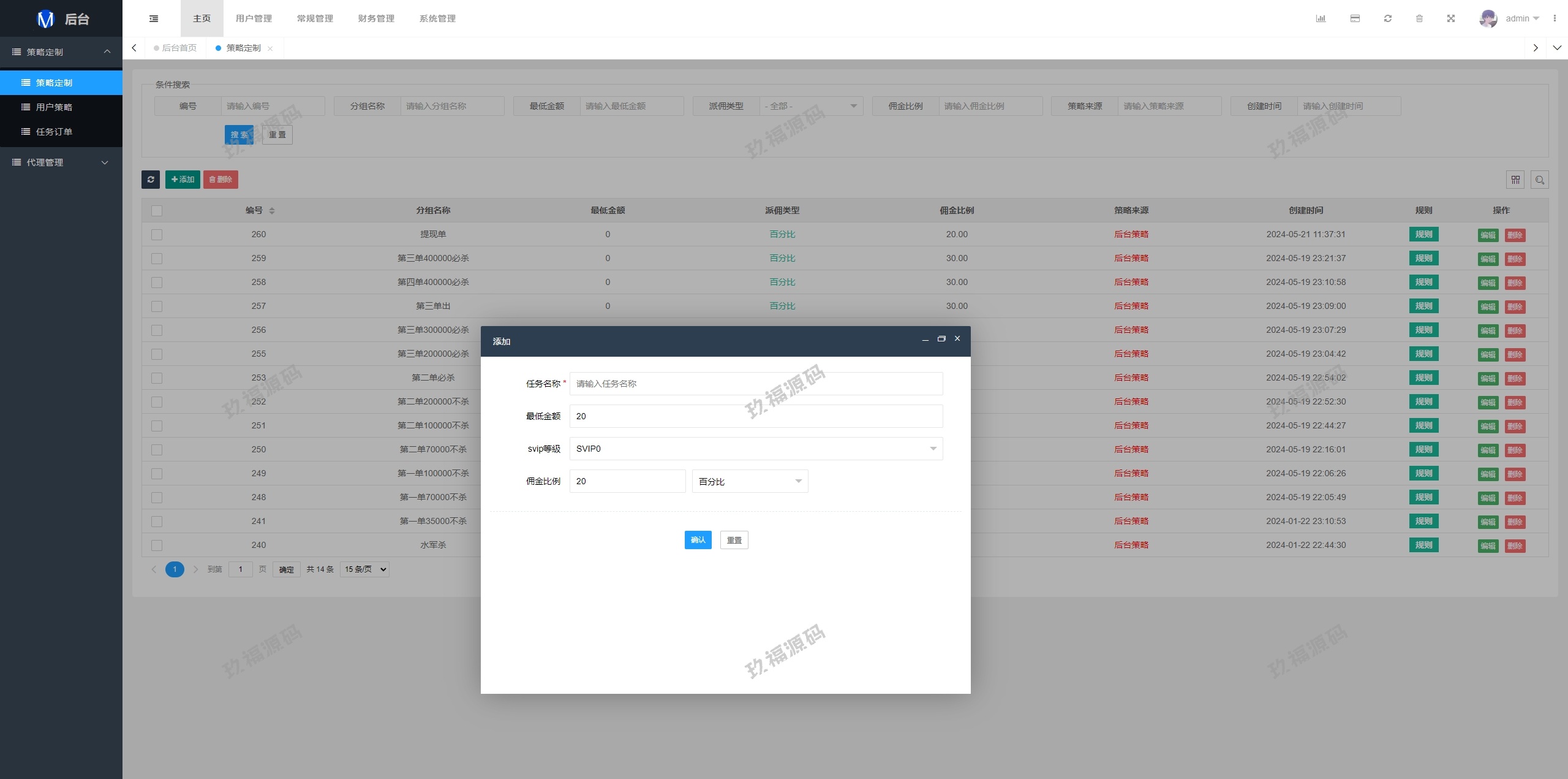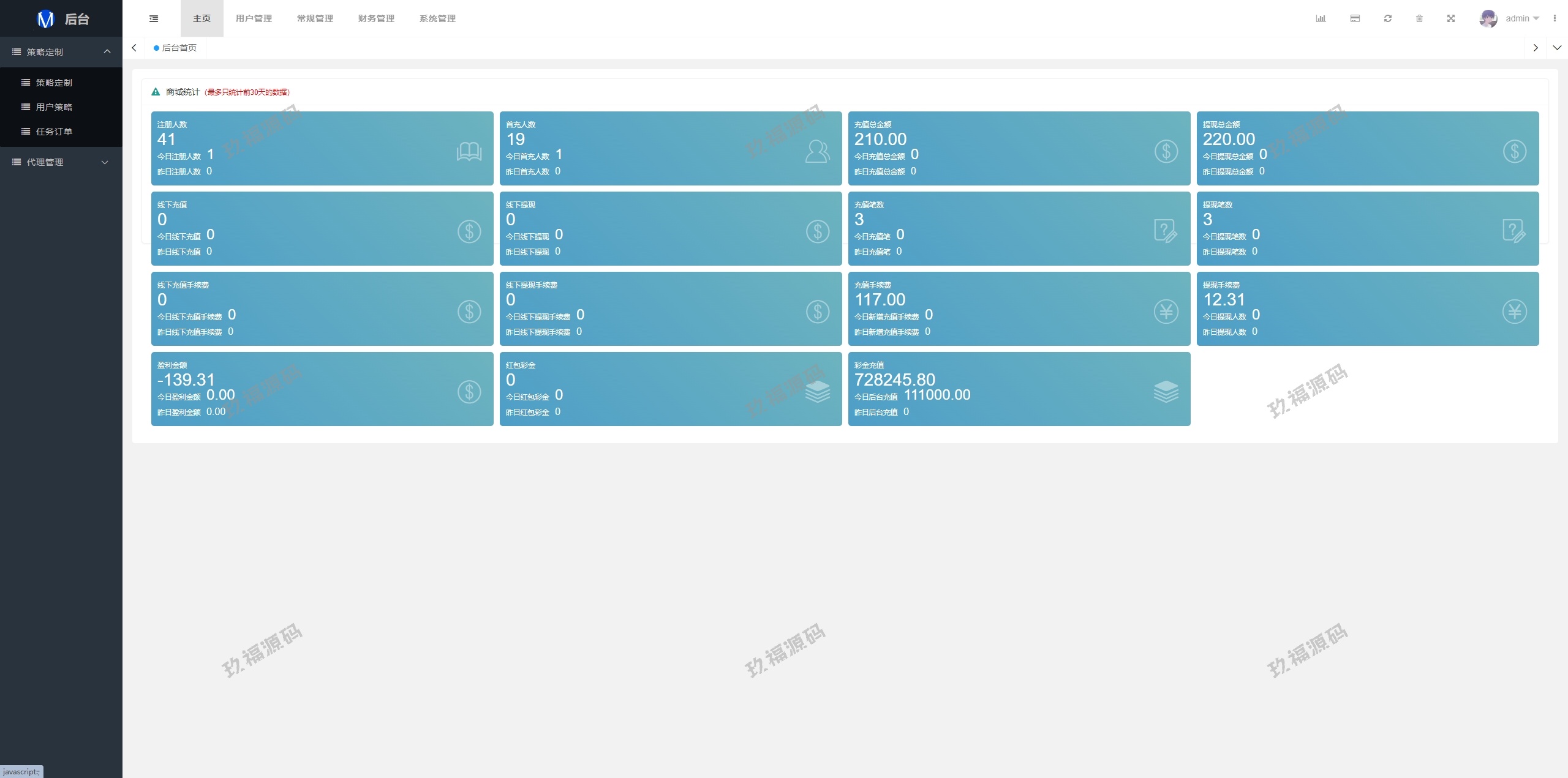 系统支持策略配置,后台共享代理后台独立,系统基本符合市场需求,单独的代理后台等功能
