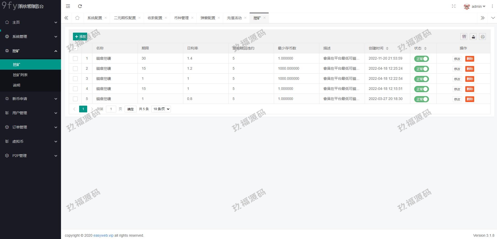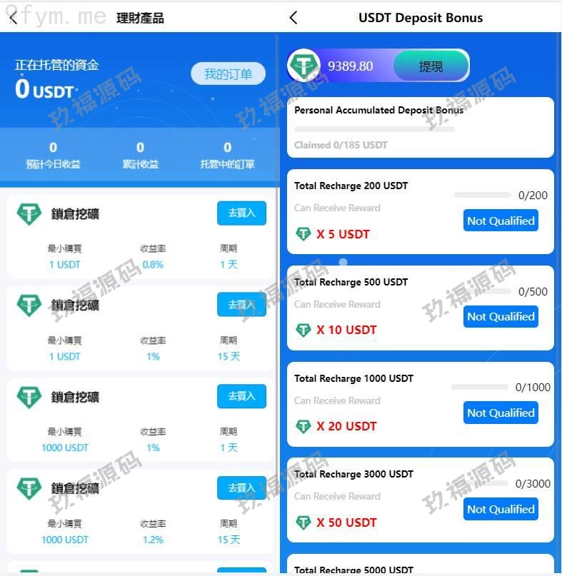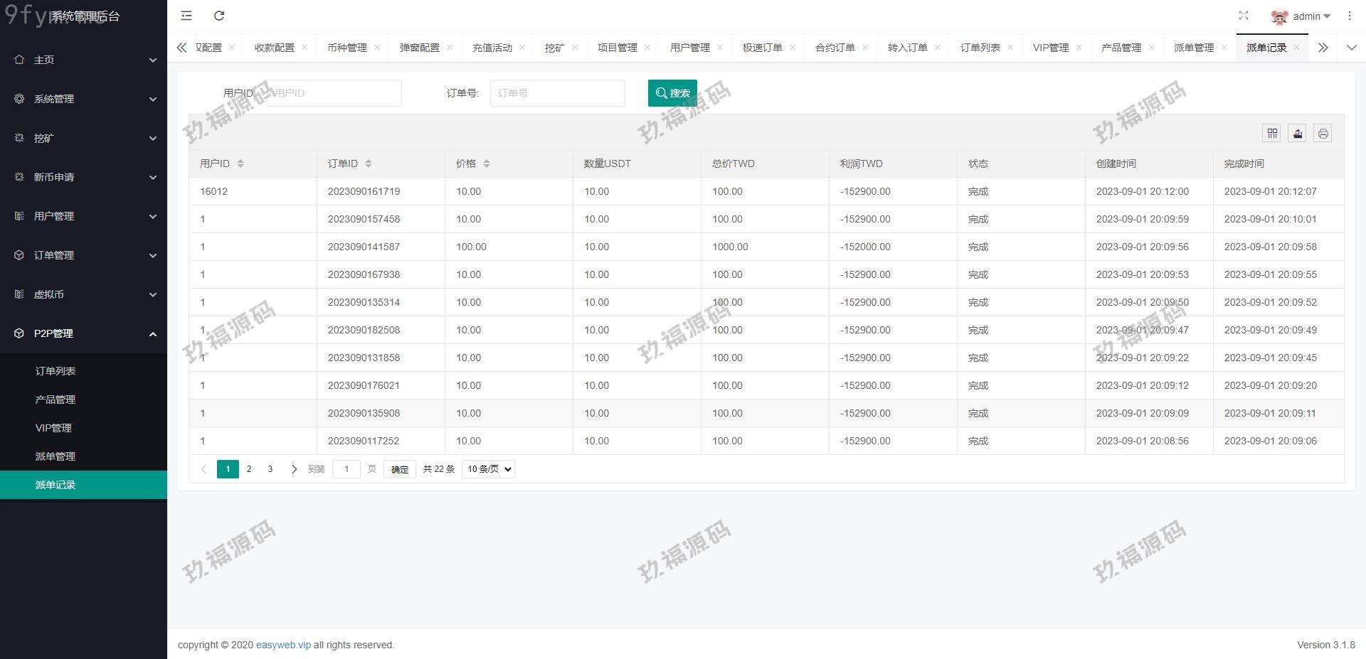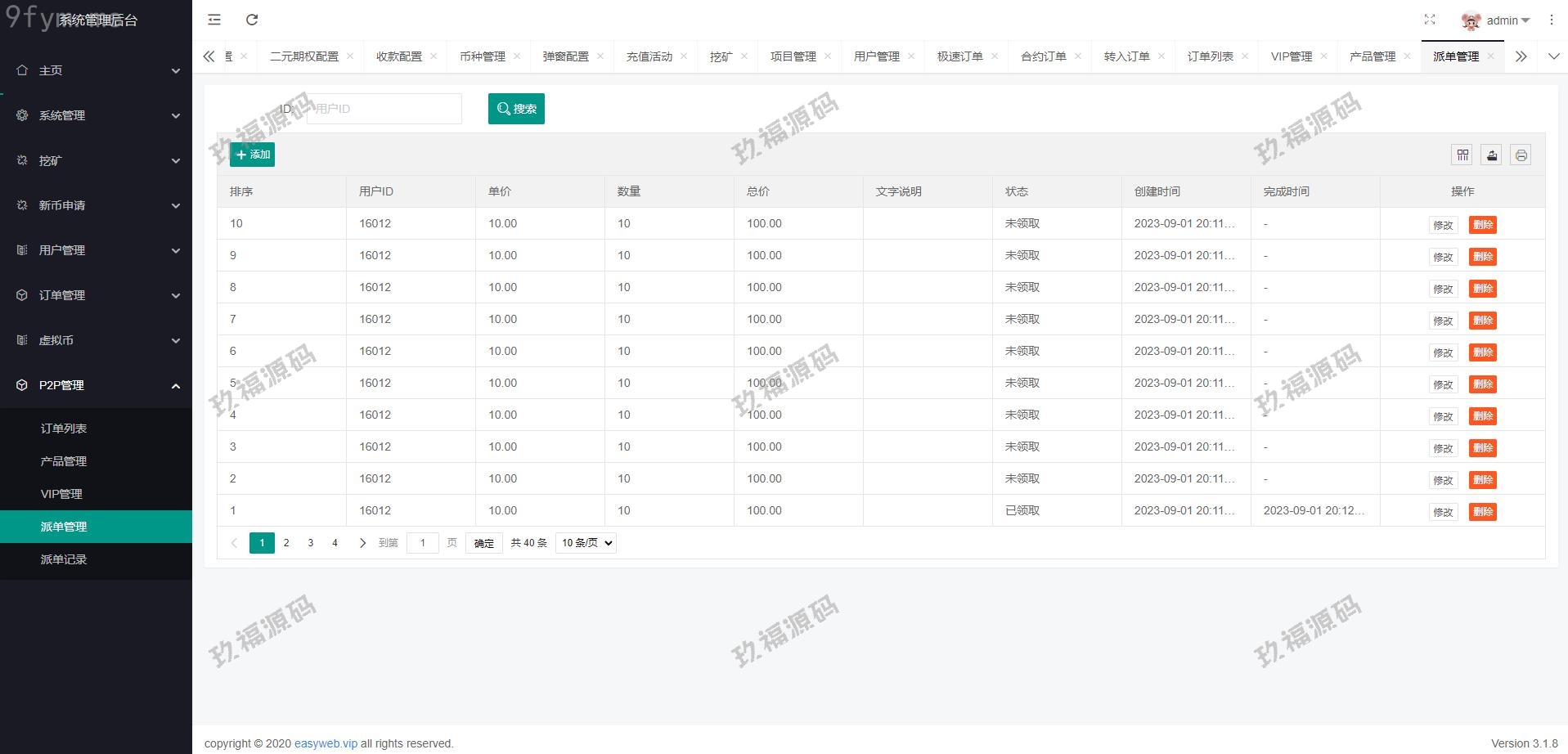 系统新增p2p理财功能、派单抢单功能,支持锁仓质押、三级分销、下单限制等功能