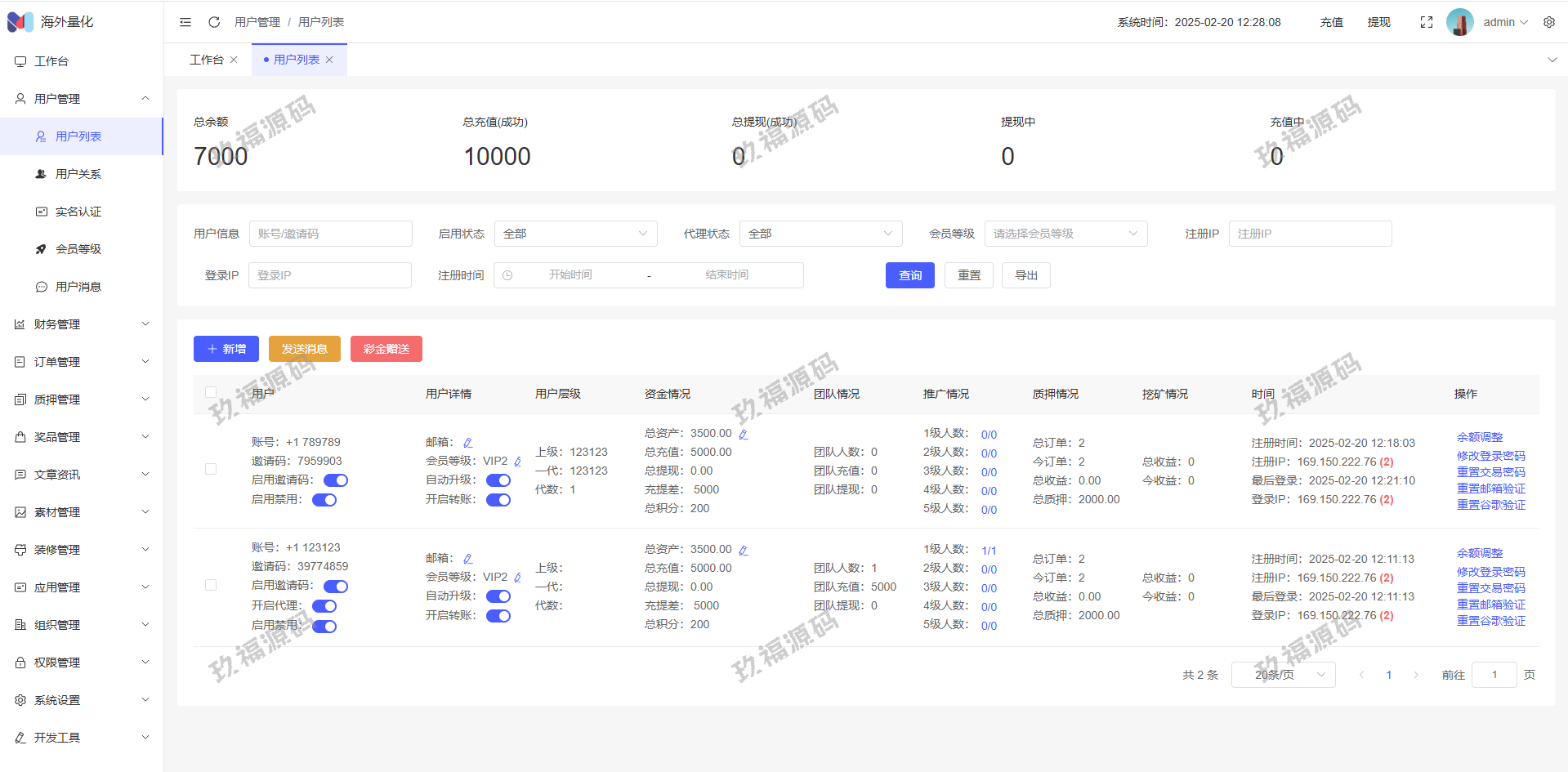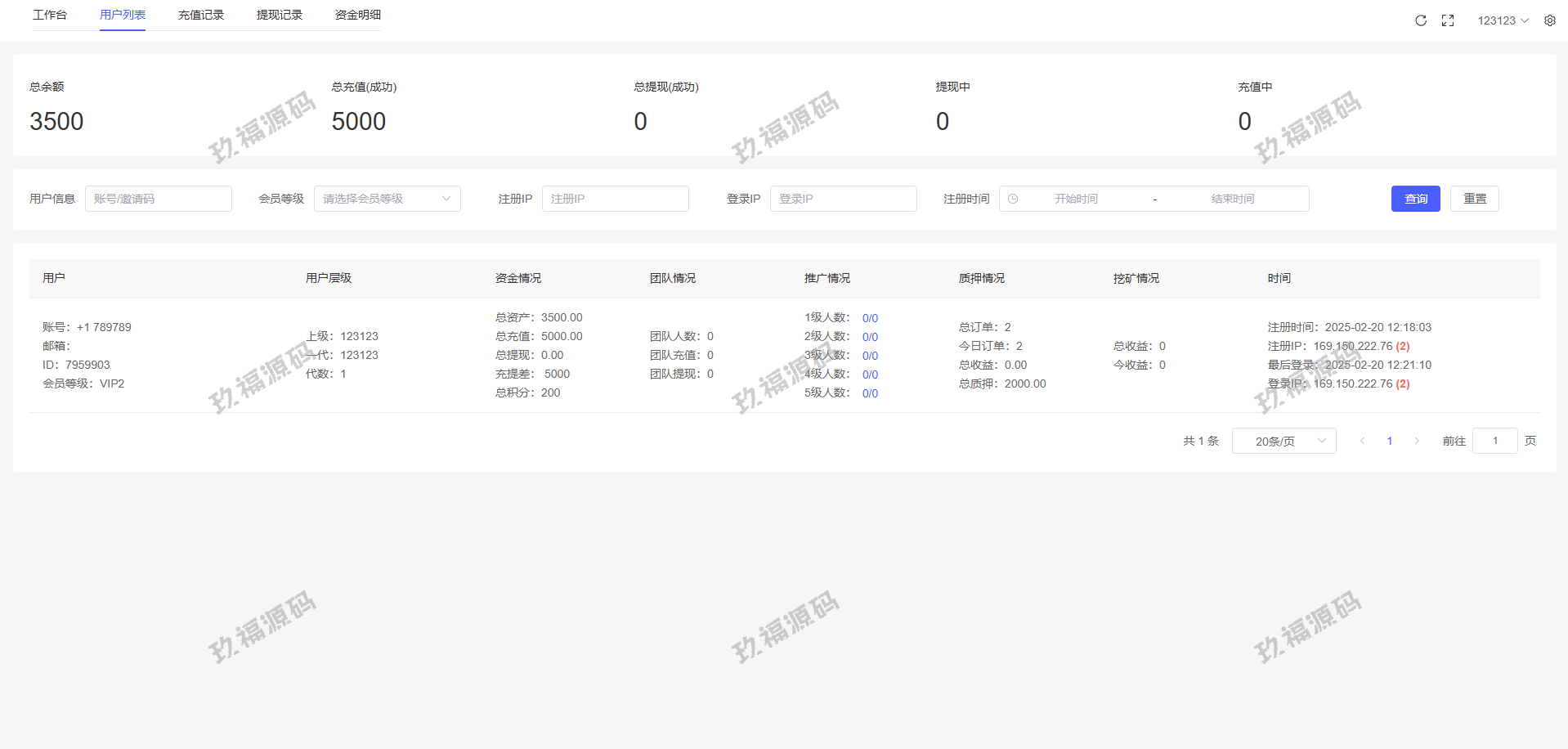 17、代理功能,后台开启用户为代理,即可登录代理端查看代理下级用户情况