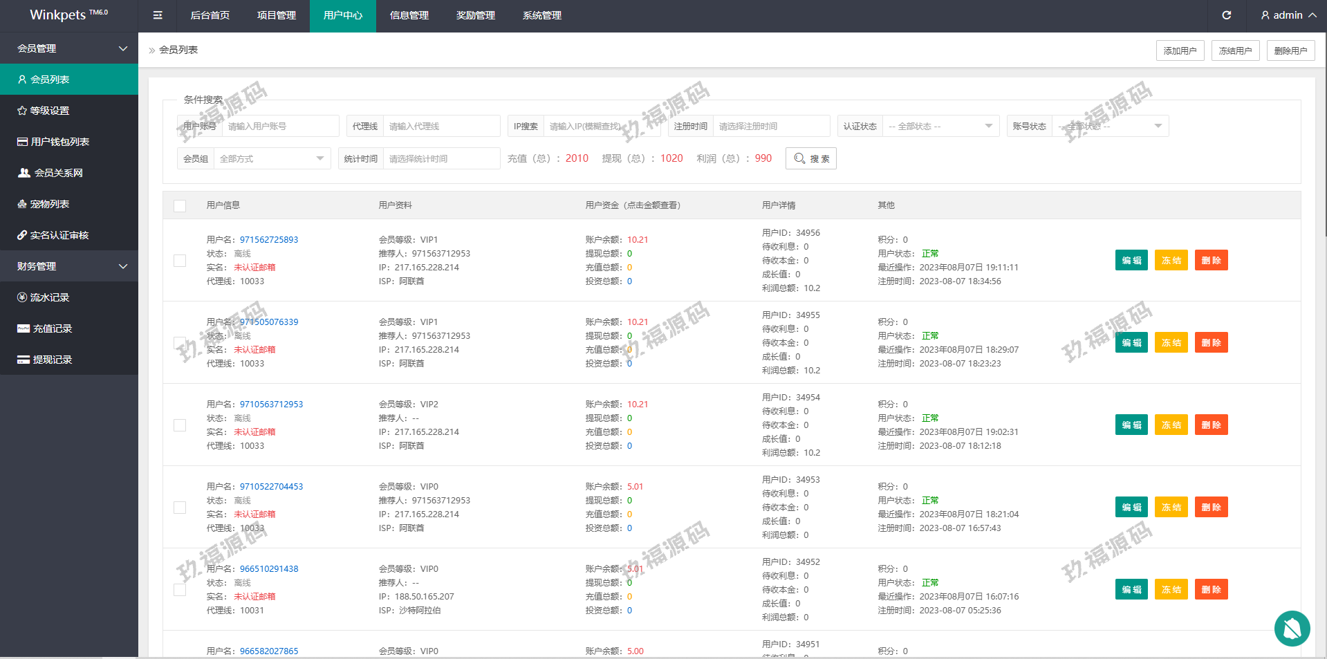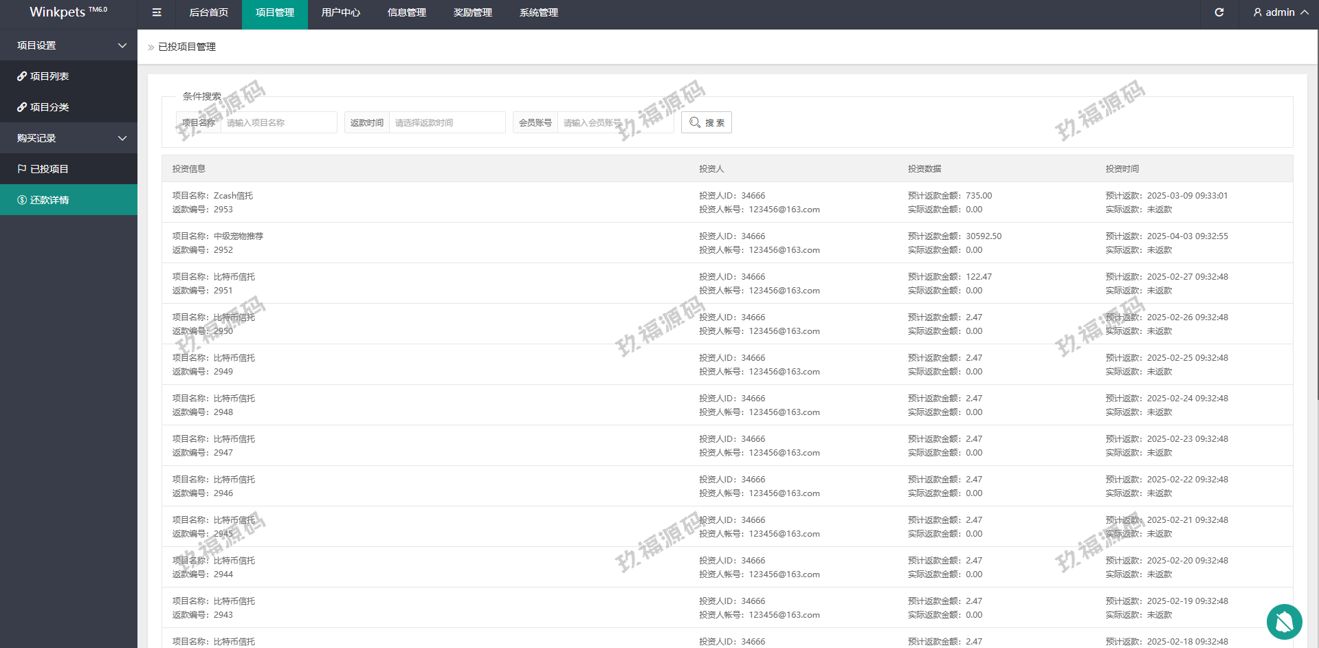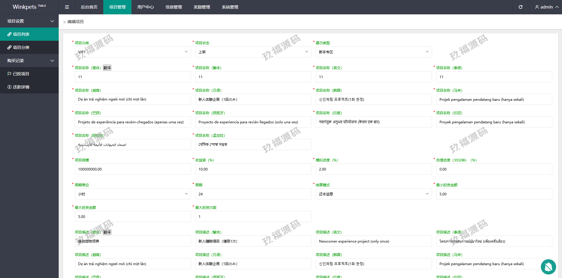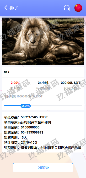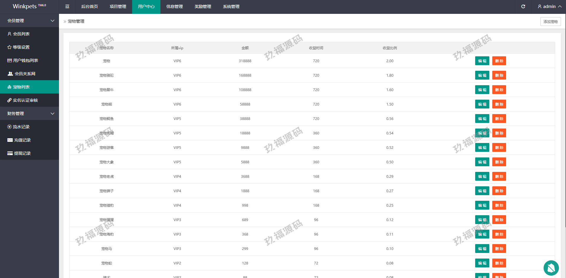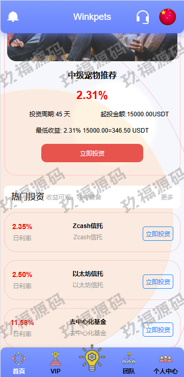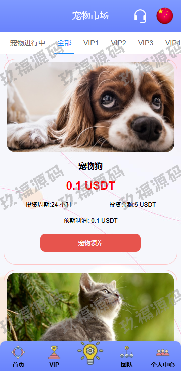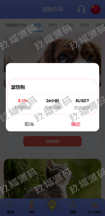 系统功能支持单独项目投资,会员等级对应级别宠物领养投资