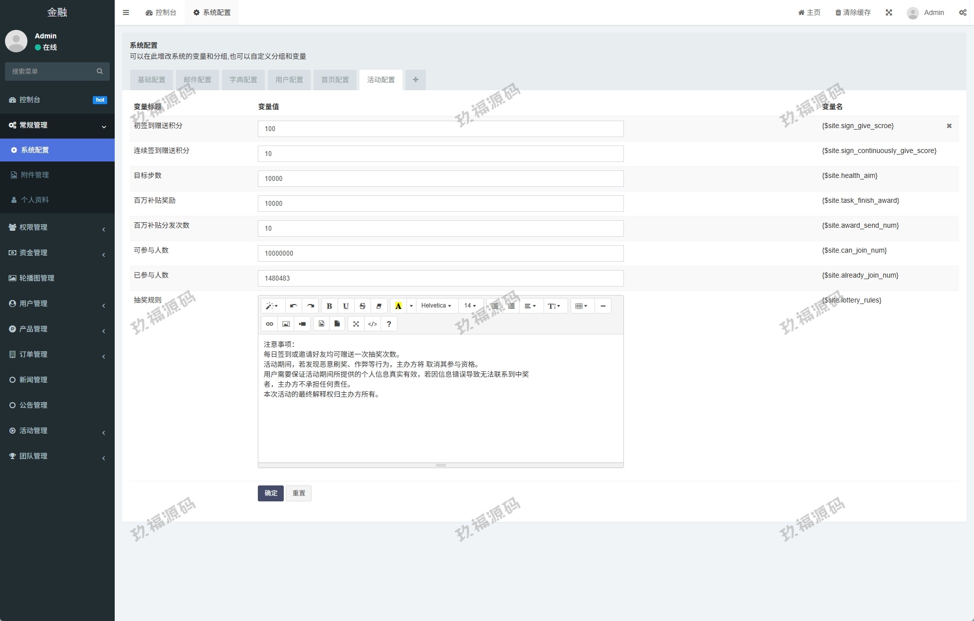 前端VUE开发,后端FastAdmin框架全开源 系统功能:签到、抽奖、爱心公益、借贷、健康数据、积分商城、活动任务等功能