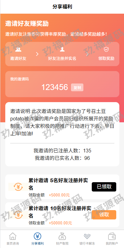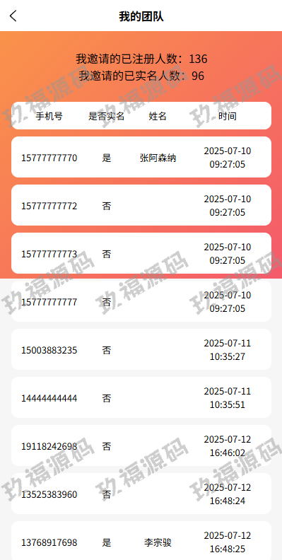 【邀请注册+实名验证奖励】系统源码,适用于各类营销裂变场景,支持用户邀请好友注册并完成实名后获取奖励。系统自动判断是否满足奖励条件,并触发发奖逻辑,助力平台快速拉新。 ✅ 邀请机制:用户专属邀请链接/邀请码 ✅ 实时统计:邀请总数 / 已实名人数 / 奖励达标进度 ✅ 奖励规则配置:如邀请 10 人,其中 5 人实名可领取奖励 ✅ 自动发奖逻辑:达标后系统自动派发奖励(如积分、余额、卡券等) ✅ 防刷机制:IP 限制、设备标识检测、实名认证对接 ✅ 后台管理:查看邀请详情、导出数据、配置奖励参数 ✅ 支持多端:H5、PC 或接入现有网站