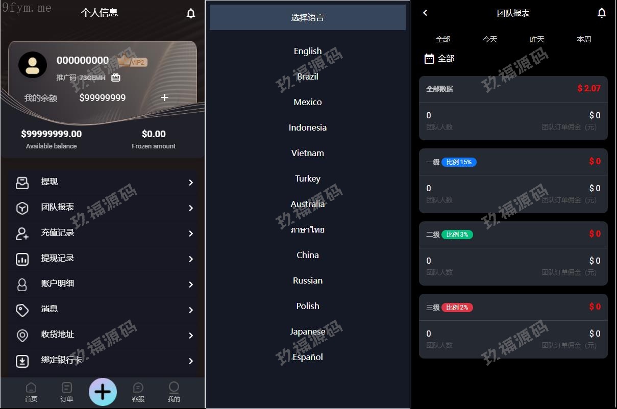 支持多国语言切换,已对接多国几十种支付接口!时区设置,代理多客服切换,余额宝 多分销 分佣模式,体验金设置,级别任务设置 等等更多火热功能!