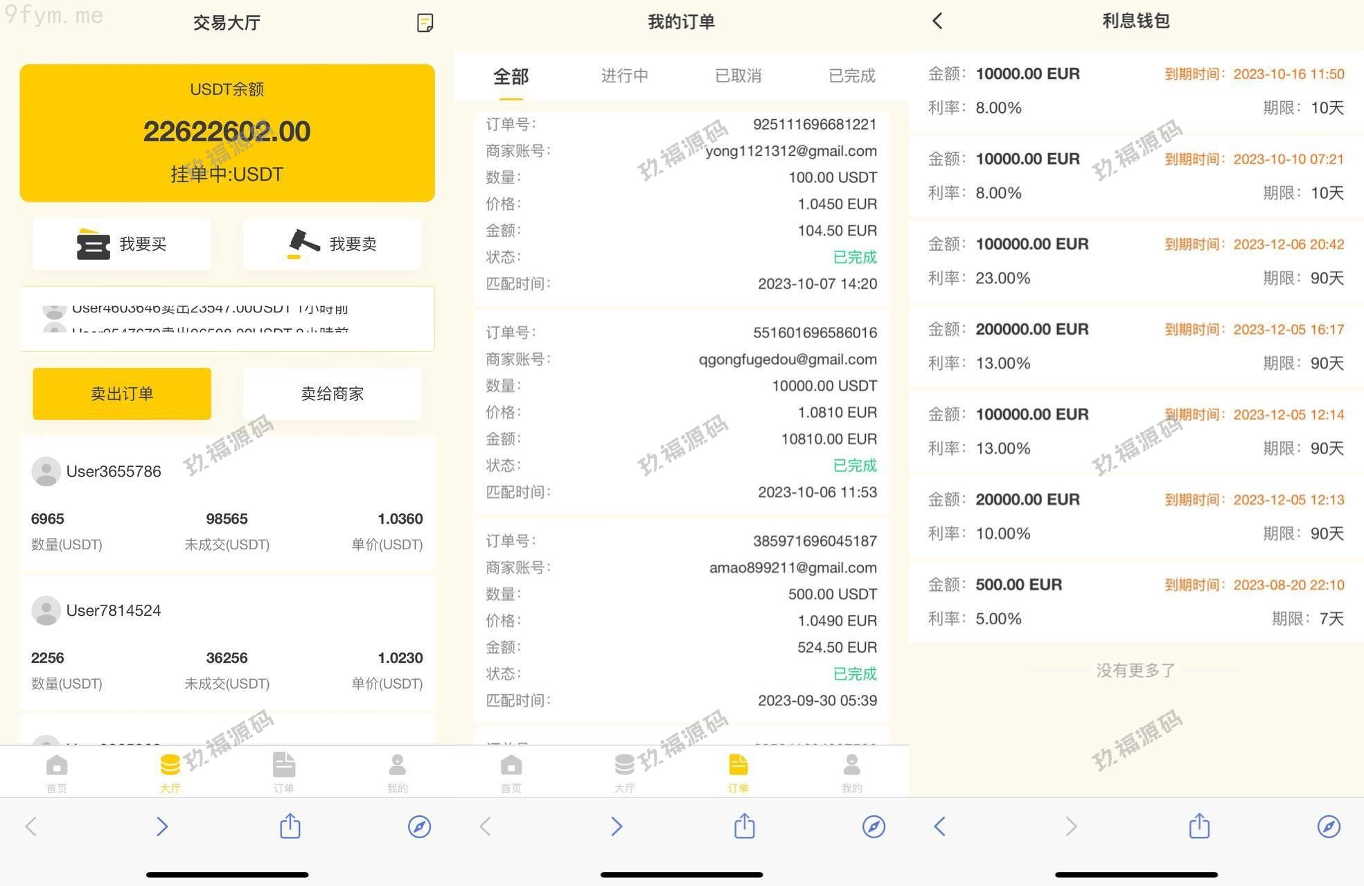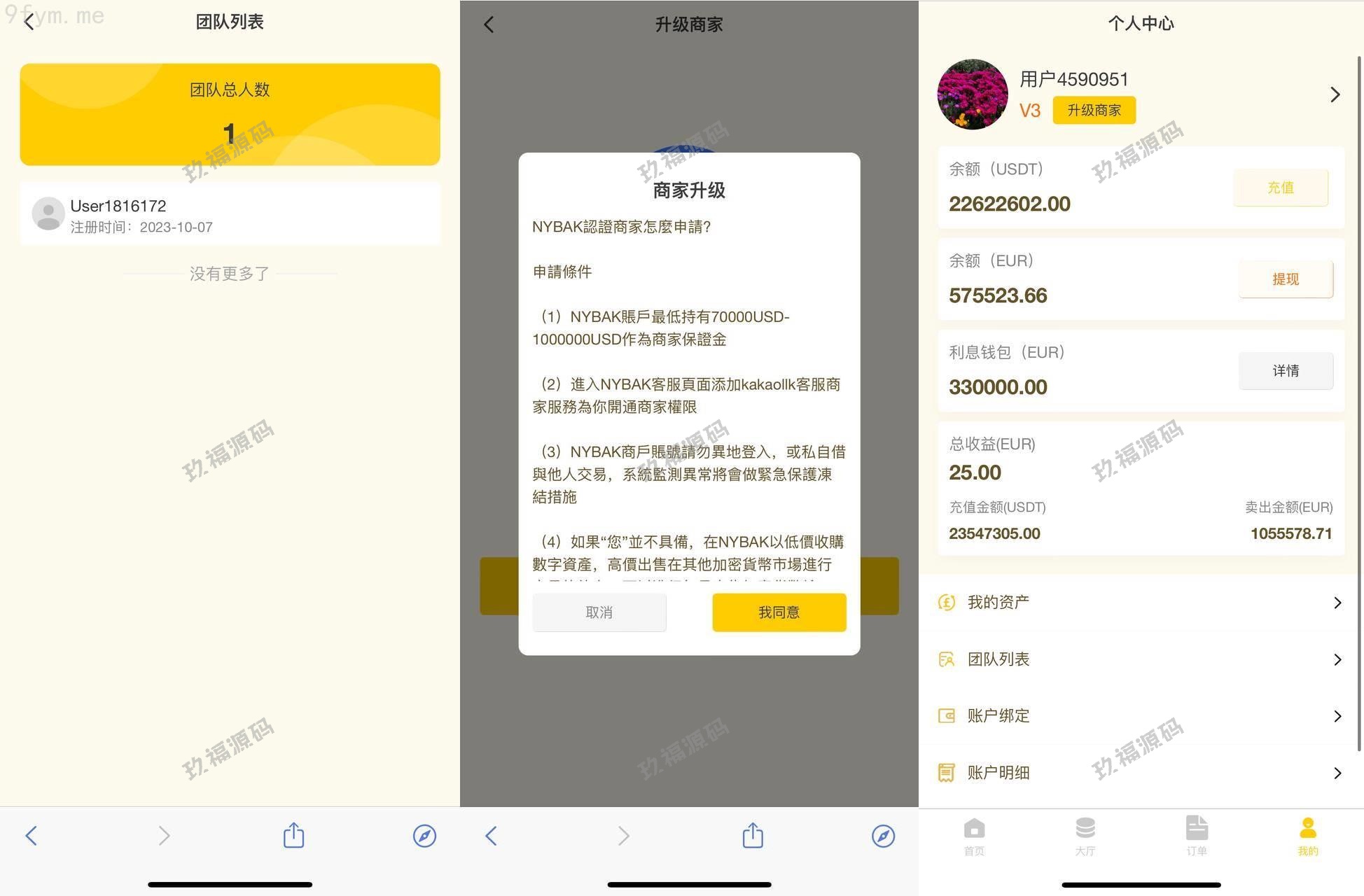 OTC交易承兑 最新版 C2C承兑 C2C理财 OTC交易 汇率自定 充值是到USDT 交易后转变成EUR钱包余额 提现的地方也是提现EUR余额 增加了(升级商家)成为商家 等级分销(VIP 等级)投资理财