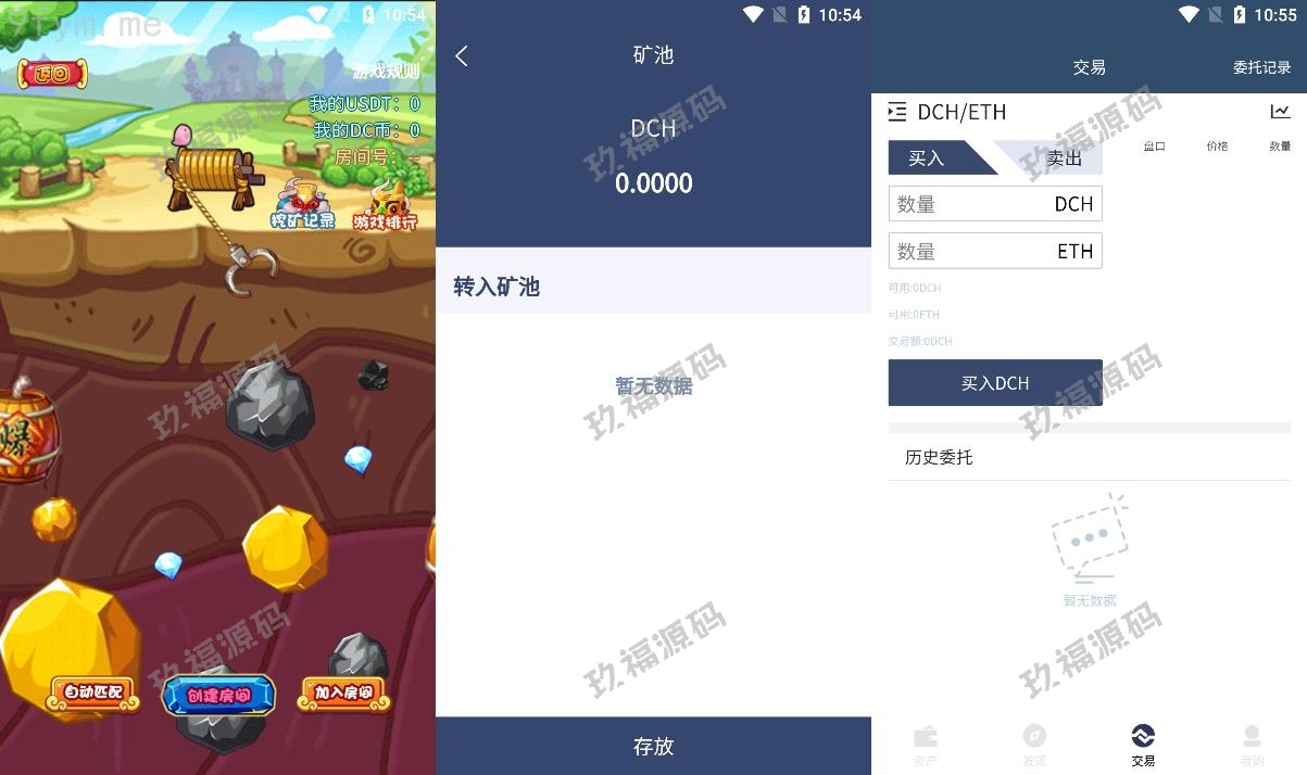 页面包含个人的分享邀请好友、矿池、币币交易、拼团游戏,等功能。