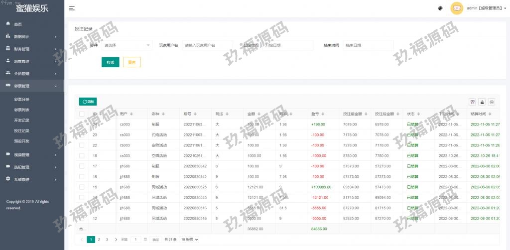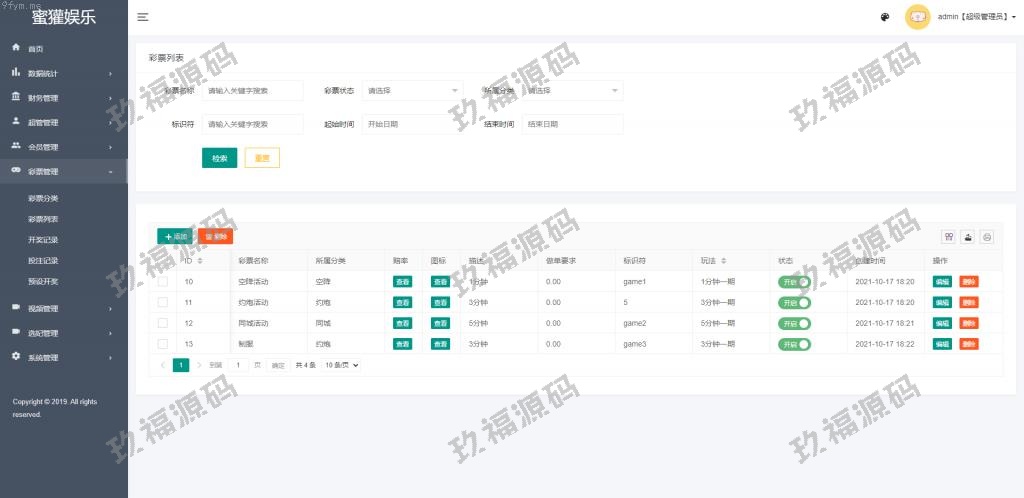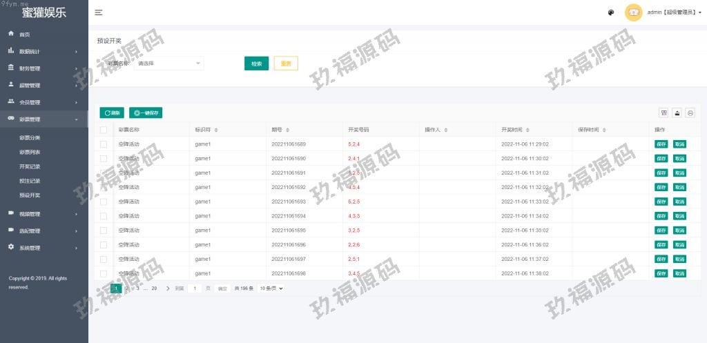 有开源代码,前端VUE框架,前后端分离,源码全开源可二开所有彩种都是系统彩,后台可控制开奖结果,可以提前预设开奖内容,带开奖脚本搭建环境:服务器Linux系统、宝塔控制面板、nginx、MySQL5.7、PHP7.0