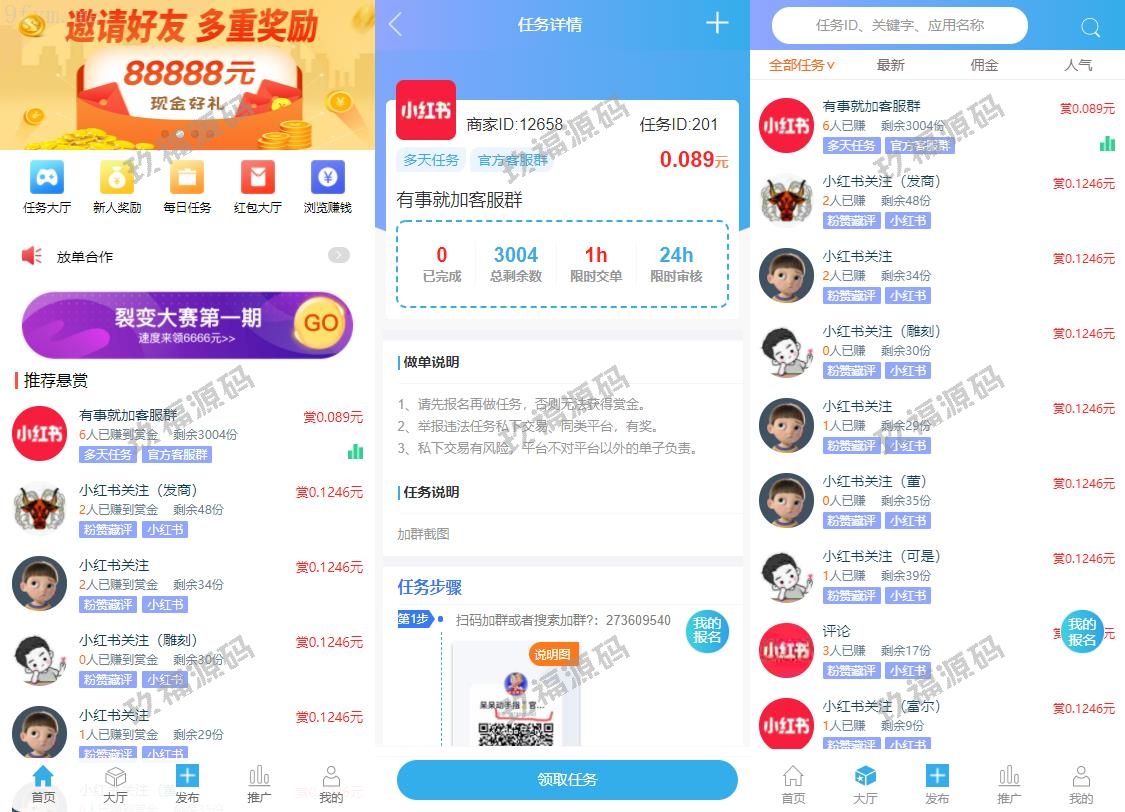 全新开发悬赏任务兼职系统,仿蚂蚁帮扶众人帮平台,功能齐全,包含接任务,发布任务,店铺关注,置顶推荐,排行榜,红包大厅,红包抽奖,任务步骤,微信绑定,分销推广,举报维权,vip会员特权等众多功能,已有客户上线运营,支持微信绑定登陆。带APP推广页