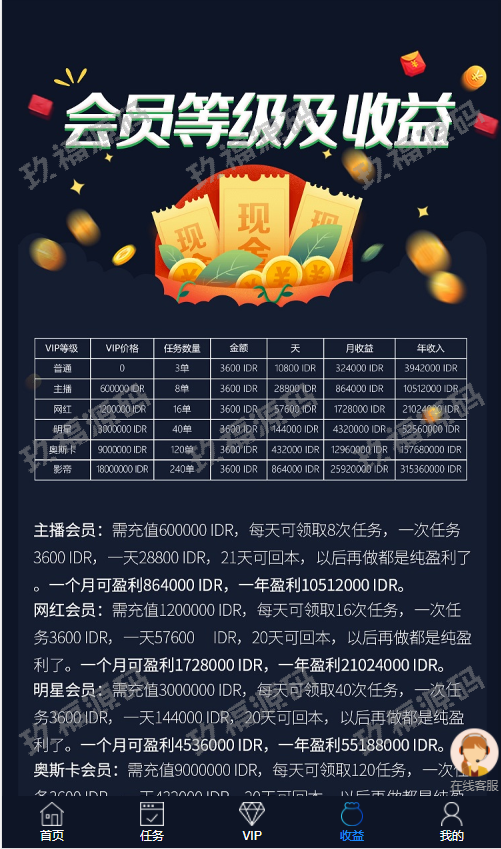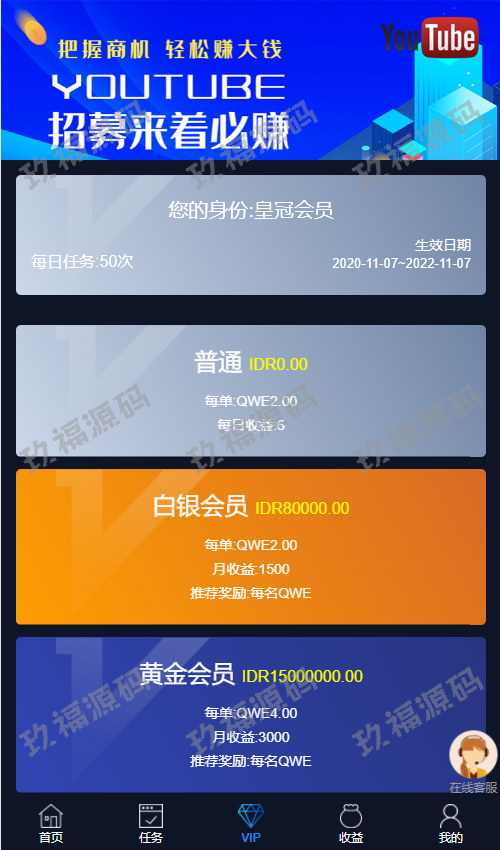 后台:可自定义设置自己的网站域名,客服qq,app名字等等、余额宝理财,财务明细等等!