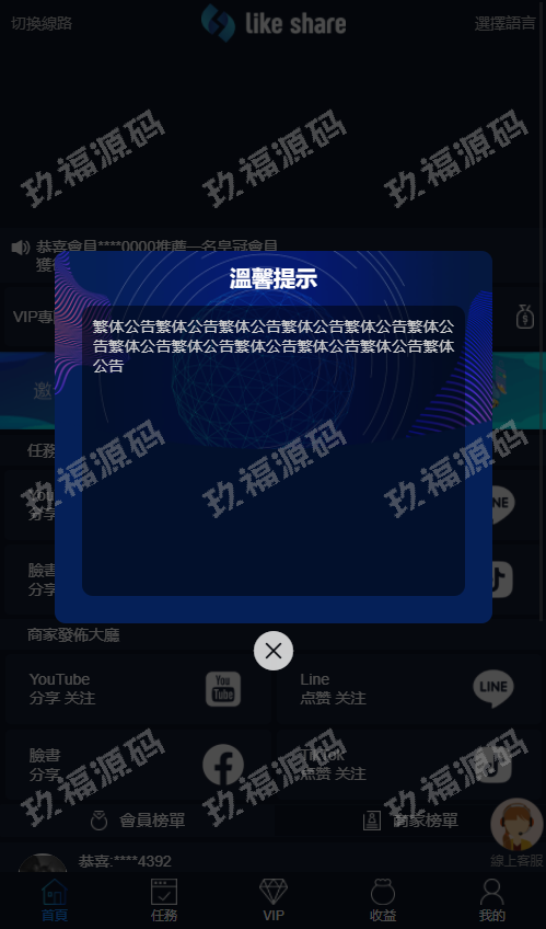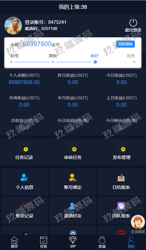 前台:首页可领取脸书tiktok等点赞关注任务!任务等级分为七种,每种等级领取的任务数量各不同。三级分销,没级代理各不同。可查看个人信誉度。