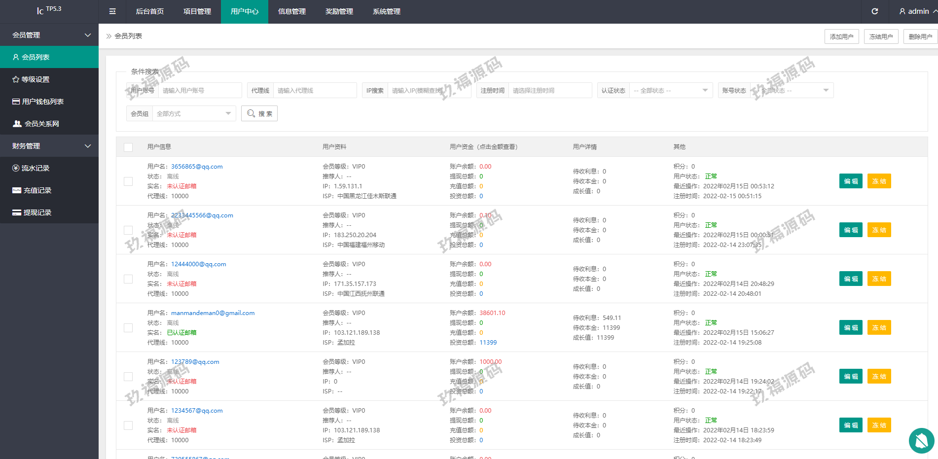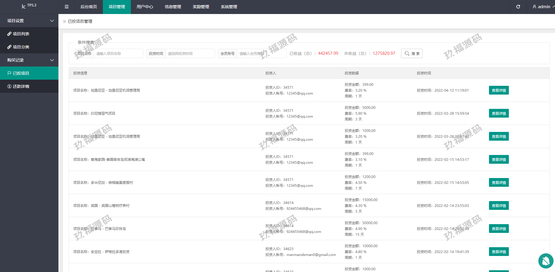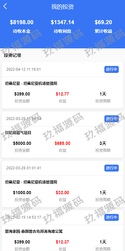 用户注册成功->认证邮箱->充值->购买项目->生成订单->根据设定的收益每日返利->末天返还本金->提现时先添加钱包->发起提现->后台审核通过->提现到账