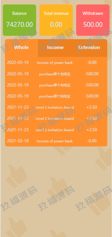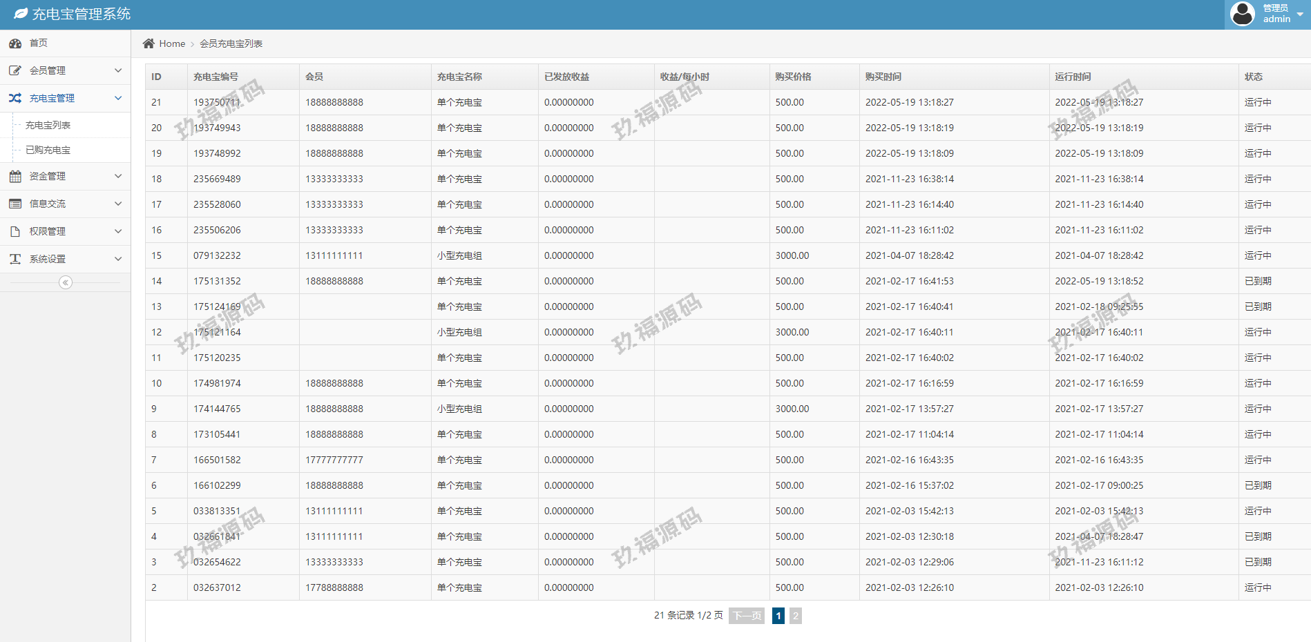 支持后台自定义添加充电宝,支持给指定人赠送充电宝,支持后台余额充值。