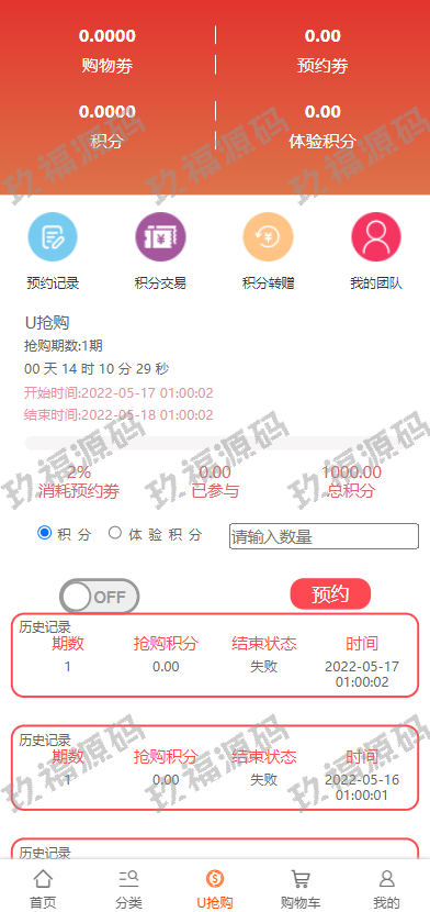 团购时间: 每期团购时间24小时,超出24小时 则从一期从新开始。自动预约:会员点开自动预约后,会根据会员的账户积分数量团购的高额度进行预约团购,自动复利复投预约。 团购期数 单账号高投入 一期:1000积分 1-30积分 第二期:1300积分1-40积分第三期:1690积分 1-50积分第四期:2197积分 1-60积分第五期:2856积分 1-70积分第六期: 3712积分 1-80积分第七期: 4825积分 1-90积分 以此类推每期递增30%的团购积分单账号高团购积分:一期; 1–30积分 第二期;1–40积分第三期; 1–50积分 第四期;1–60积分1期 —— 9期 单账号每期递增10积分10期——19期 单账号每期递增100积分20期——29期 单账号每期递增500积分30期以上 单账号每期递增1000积分团购收益:每期在规定的24小时内,团购成功,可获得该期参与团购积分额度12%的收益。 例如:本人一期参与团购100积分,本期团购成功后收益就是12积分,本金积分加奖励积分总计获得:112积分一期所有奖励在第二期团购成功后结算第二期所有奖励在第三期团购成功后结算以此类推……假如:在某一期规定时间内(24小时),团购积分没有完成,则团购积分失败,该期为失败期。 举例:(以第七期团购积分额度失败举例)第七期所有玩家投入的积分和预约劵全额退回第六期所有玩家投入的积分 70%的积分退回+10%预约劵+20%购物券。在第七期团购失败后 从一期重新开始参与团购第六期与第七期的所有用户自动优先预约排队进入团购结算周期:团购成功后进2期结算1期。完成第2期奖励第1期本金加12%积分。完成第3期奖励第2期本金加12%积分,以此类推。使用体验积分参与预约的会员体验积分预约成功扣除投入的体验积分数量,获得投入数量的12%积分 (收益不返还本金)体验积分预约失败后全额返还(体验积分)直推一人完成手机号码认证奖励100体验积分所有奖励都是级差制度 直推 动态 平级 团队总业绩V1 5人 1% 无 5千积分V2 10人 2% 2% 5万积分V3 15人 4% 3% 50万积分V4 20人 6% 4% 300万积分V5 25人 8% 5% 600万积分备注:玩家每期参与团购,需要使用积分+消耗2%的预约劵(预约劵与积分的价值是一样的)例如:100积分需要消耗掉2%的预约劵