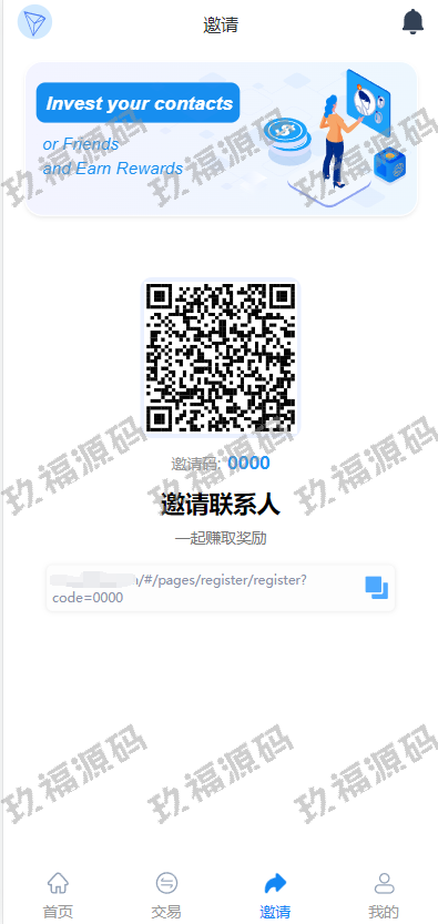 1. 邀请。用户可以通过二维码或者邀请链接推广注册,通过这个邀请链接注册的用户,都会在你的下级,客户通过你的邀请链接注册后你可以得到佣金(后台可设置),之后下级用户充值或者获取收益你都会有返佣 (该收益是到钱包账户) 用户不可提现