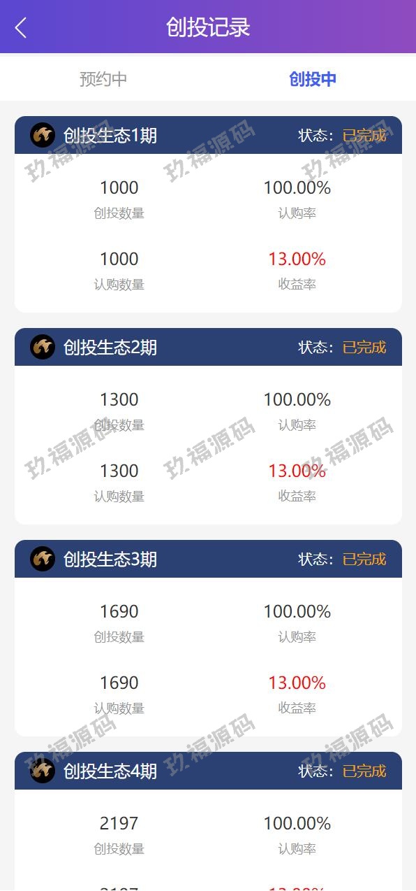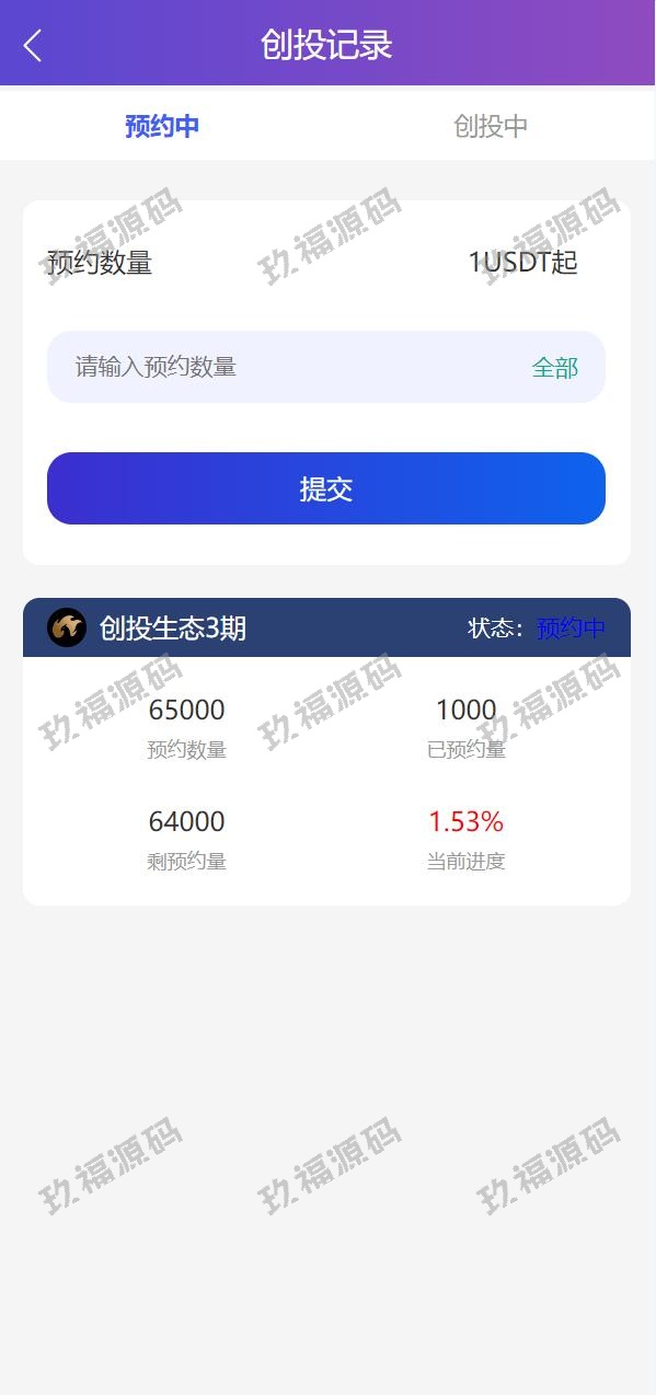 一款usdt众筹投资分红的系统,支持发布多期众筹,步骤分为预约中-创投中-已完成