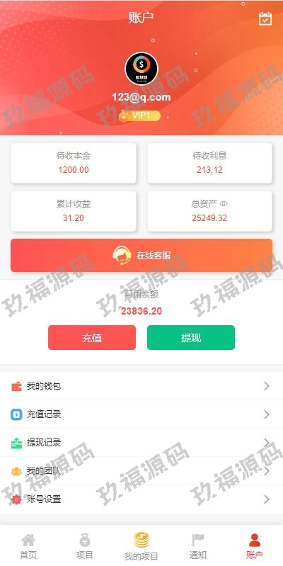 用户注册成功->认证邮箱->充值->购买项目->生成订单->根据设定的收益每日返利->末天返还本金->提现时先添加钱包->发起提现->后台审核通过->提现到账